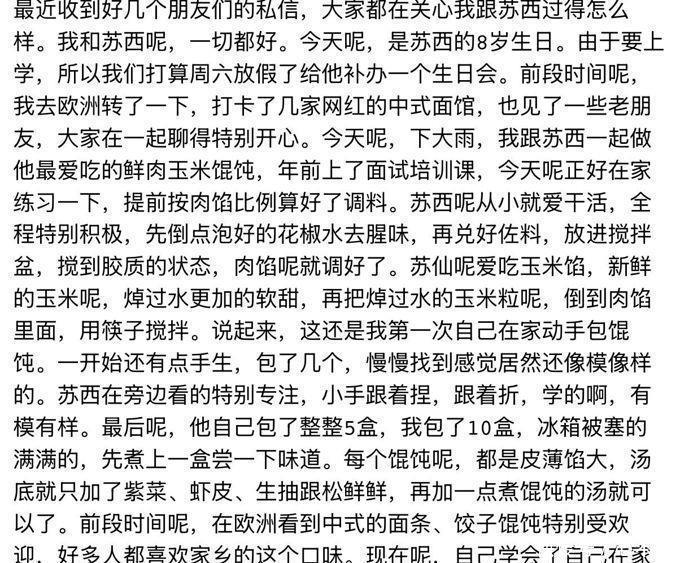 与此同时,小雪在这段期间并未对视频进行更新,这也导致了人们对她的评价逐渐增多。在众人的关注下,小雪又一次分享了她的视频,视频里,小雪向所有人保证,她与苏西的关系都很和谐。在苏西的生日这一天,小雪特地与苏西共同包制了馄饨,整个场景显得非常温暖和幸福。