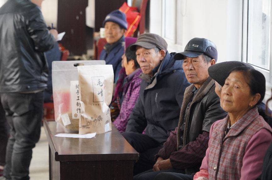 3月21日早晨6点不到,岱山村村民周世翠带着前一晚精心择好的水芹、蒲公英,熟门熟路地来到箕山村。走进直播间,村干部早已等候,递上写着“9号”的小纸片。这小小的号码,是她安心的来源。她把袋子往地上一放,接过一杯热气腾腾的开水,安稳地坐在长椅上等候。